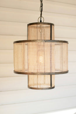 Round double layered woven fiber and metal pendant light